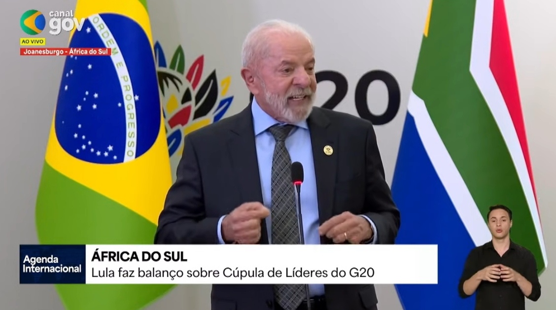 Defesa do multilateralismo no âmbito do G20 como caminho para a solução dos problemas globais. Discussões sobre ferramentas para reduzir desigualdades e a insegurança alimentar. Debates sobre os usos e desafios diante da inteligência artificial, da transição energética, do uso de minerais críticos e do trabalho decente. O presidente Lula fez no domingo, 23/11, em Joanesburgo, um balanço de sua passagem pela Cúpula do G20, na África do Sul.