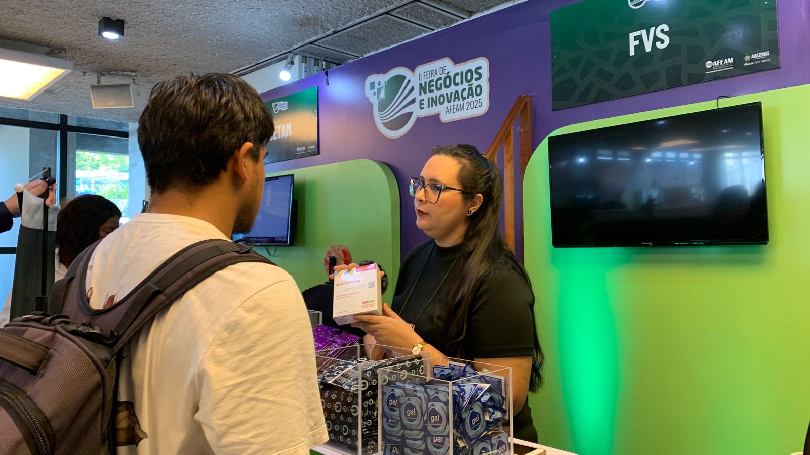 A estudante Ayume Freitas, de 21 anos, destacou a relevância da iniciativa. “A Feira de Negócios e Inovação da AFEAM 2025 tem sido uma oportunidade incrível. A distribuição gratuita de autotestes de HIV, preservativos e gel, junto às orientações oferecidas, torna a visita ao estande da FVS-RCP muito esclarecedora e útil”, afirmou.