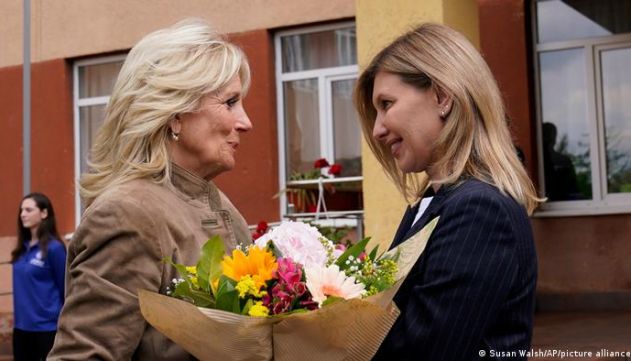Jill Biden, que estava viajando pelo país vizinho, a Eslováquia, deu flores a Zelenska, que fazia sua primeira aparição pública desde que a invasão russa, começou em 24 de fevereiro, segundo uma autoridade norte-americana. As duas se abraçaram.