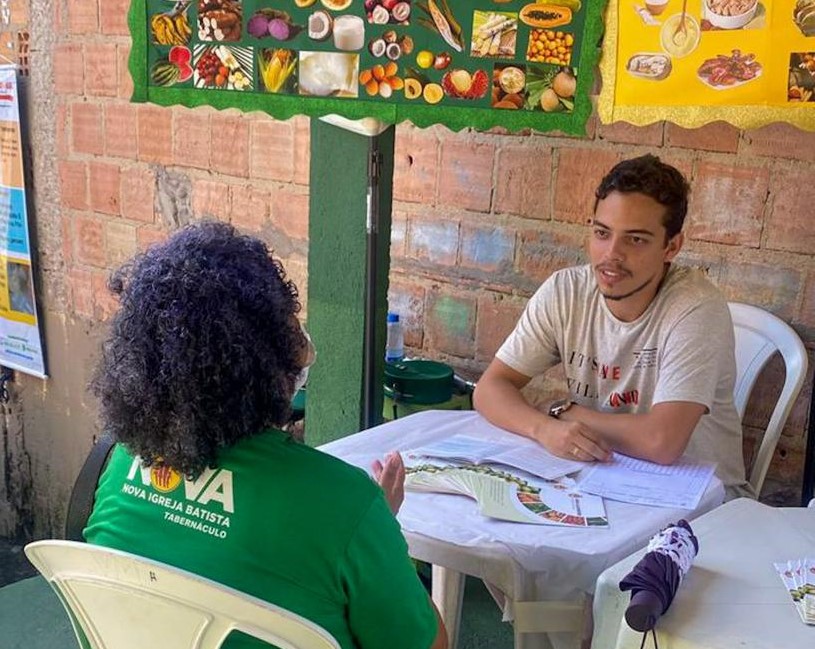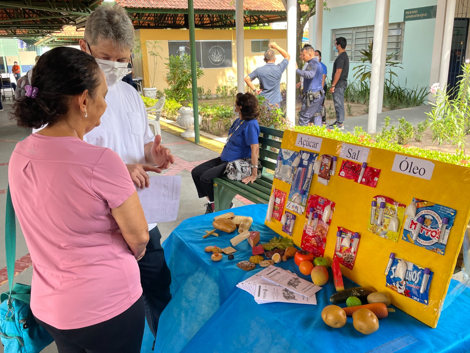 Profissional da Semsa orienta mulher diante de mesa com legumes em ação sobre alergia alimentar