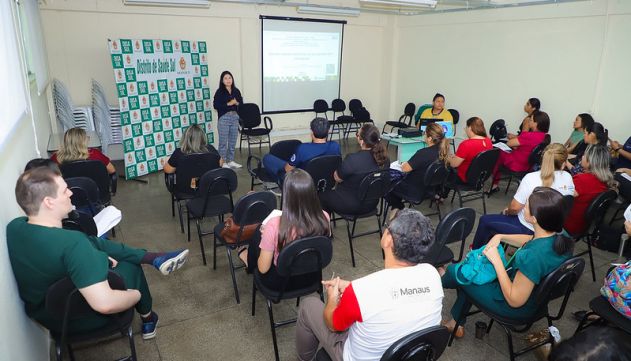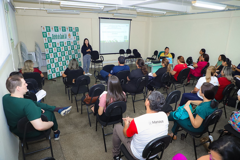 A programação aconteceu no auditório do Distrito de Saúde (Disa) Sul, bairro Adrianópolis, zona Sul, reunindo 34 profissionais de saúde, entre médicos e enfermeiros