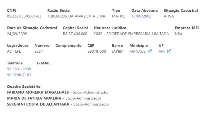 Durante a apuração, a reportagem identificou três nomes no quadro societário da empresa Tuboaços da Amazônia: Fabiano Moreira Magalhães, Maria de Fátima Moreira e Sergiani Costa de Alcântara. A empresa é responsável por fabricar expositores, material de ponto de venda, artigos promocionais e sinalizadores.