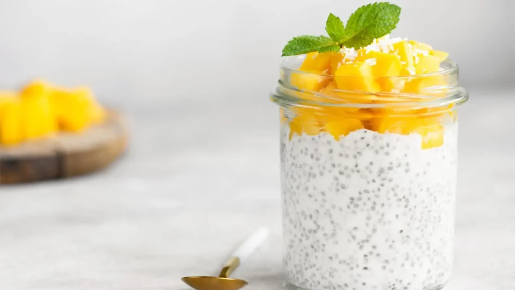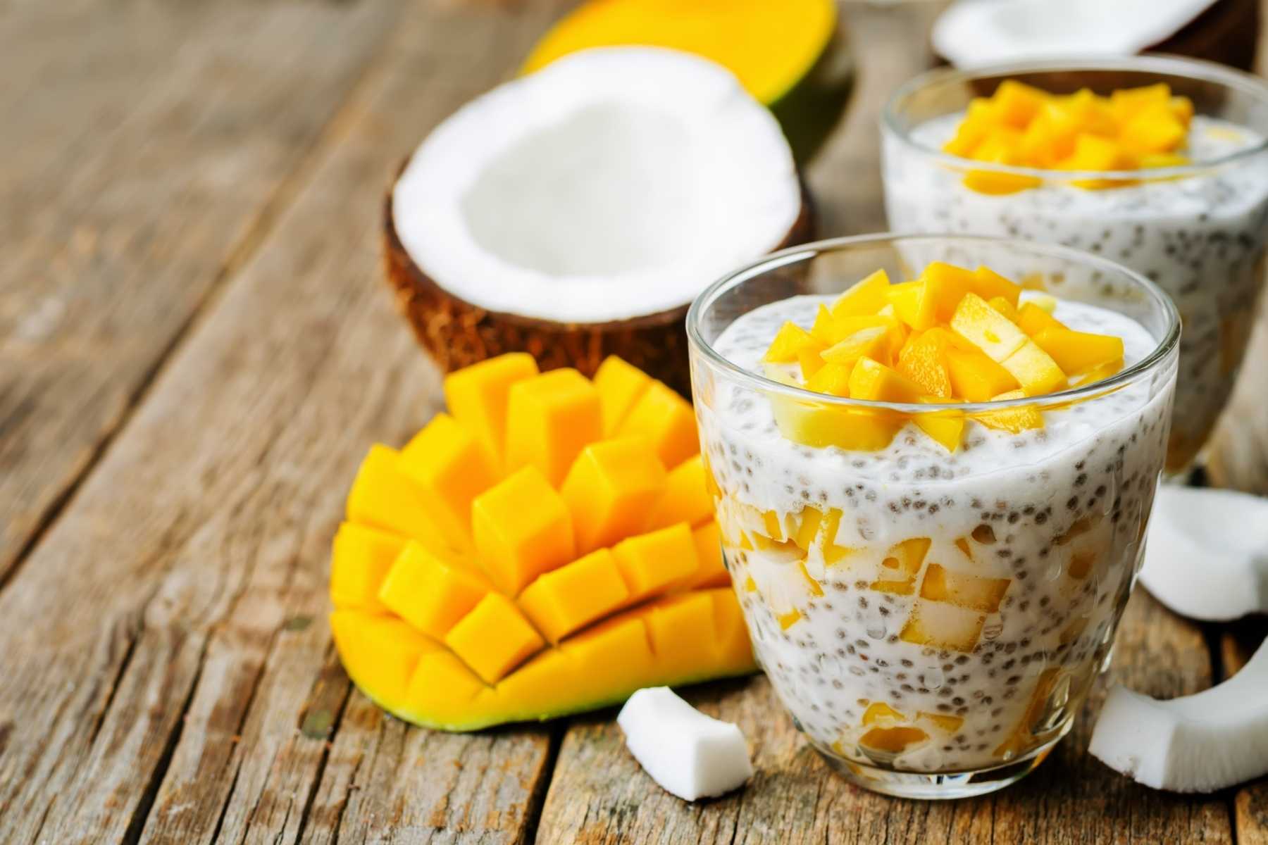 Monte camadas da chia com leite de coco e cubos de manga em copos ou tigelinhas individuais.