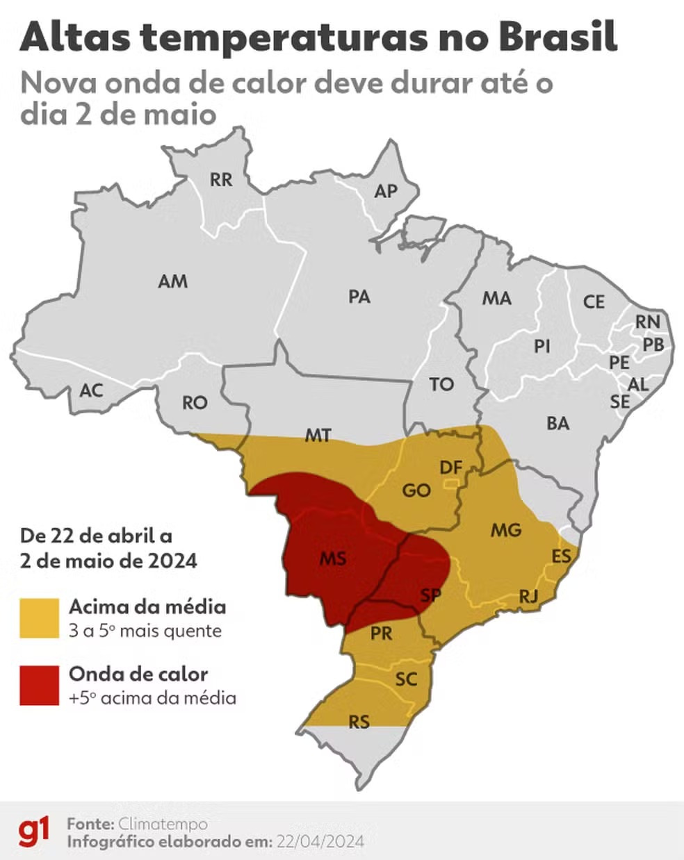 A quarta onda de calor do ano no país já está em vigor e deve durar até a próxima semana, de acordo com as previsões. Por causa disso, segundo a Climatempo, temperaturas acima da média devem ser observadas até a próxima quinta-feira, 2/5, no Centro-Sul.