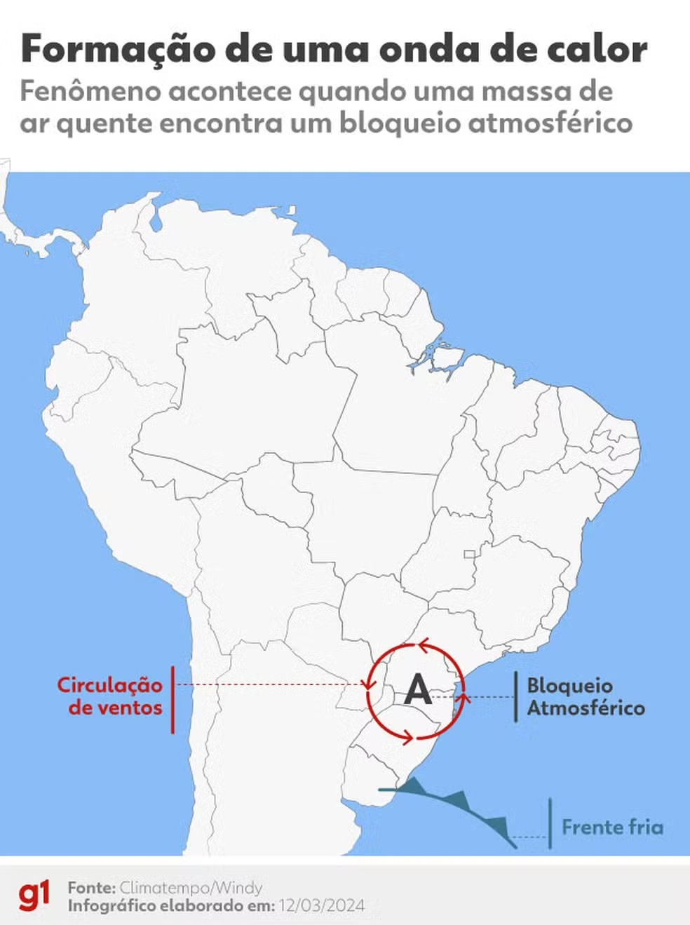 Nesse cenário, as frentes frias se formam, tentam avançar, mas encontram um bloqueio, o que as leva diretamente para o oceano. Assim, a massa de ar quente no continente vai ficando cada vez mais forte, gerando uma onda de calor.Os meteorologistas definem que uma onda de calor acontece quando a temperatura fica pelo menos 5ºC acima da média por um período de cinco dias ou mais.