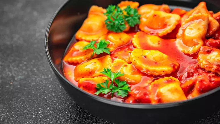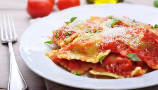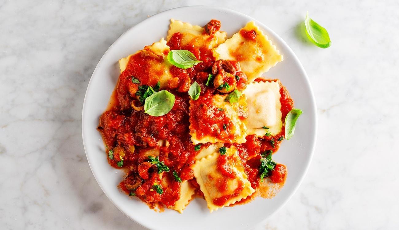 Esse ravióli com molho vermelho é perfeito para almoço em família