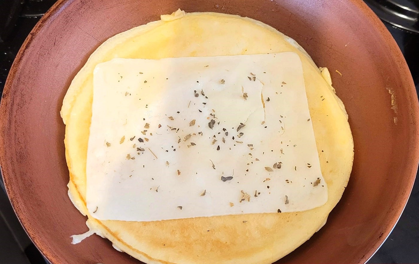 5. Adicione o recheio de sua preferência em uma metade da crepioca e dobre a outra metade por cima. Deixe cozinhar por mais alguns instantes até que o recheio esteja aquecido.