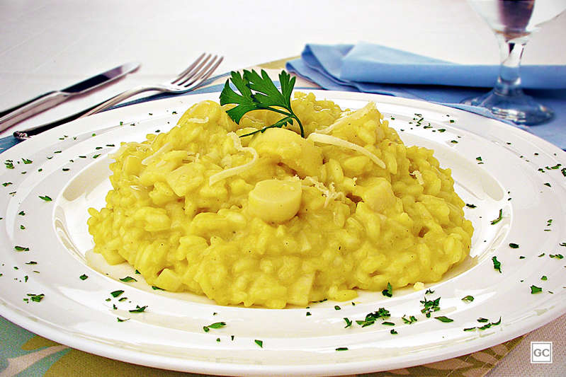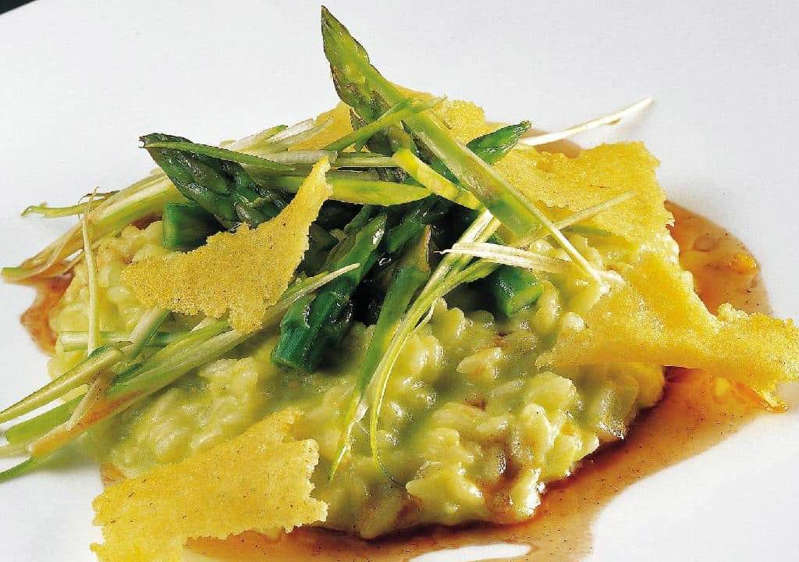 Refogue a cebola no azeite de oliva em uma panela de fundo grosso até amolecer. Adicione o arroz de risoto, em fogo baixo e frite até ficar translúcido. Despeje o vinho branco, mexendo até que evapore. Adicione os aspargos picados sem as pontas e uma concha do caldo de galinha dissolvido na água. Assim que o caldo for absorvido, adicione mais uma concha sempre que necessário. Continue por 16 minutos ou até que o arroz fique ‘al dente’. Adicione as flores de abobrinha picadas, a água misturada com açafrão, misture a manteiga e o parmesão e mexa. Divida em 4 pratos e decore com as pontas de aspargos fervidas antecipadamente por 5 minutos.
