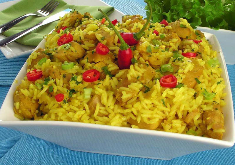 Retire a pele do frango. Pique e tempere o frango com sal, pimenta e o limão e deixe descansar por 30 minutos. Em uma panela, aqueça o azeite em fogo médio e frite o frango até dourar. Adicione a cebola e o alho e frite por mais 5 minutos. Coloque o açafrão e o arroz e frite, mexendo por mais 3 minutos. Despeje a água fervente, o sal, tampe a panela e cozinhe em fogo baixo por 20 minutos. Coloque em uma travessa e polvilhe com salsa, a pimenta e cebolinha picada antes de servir.