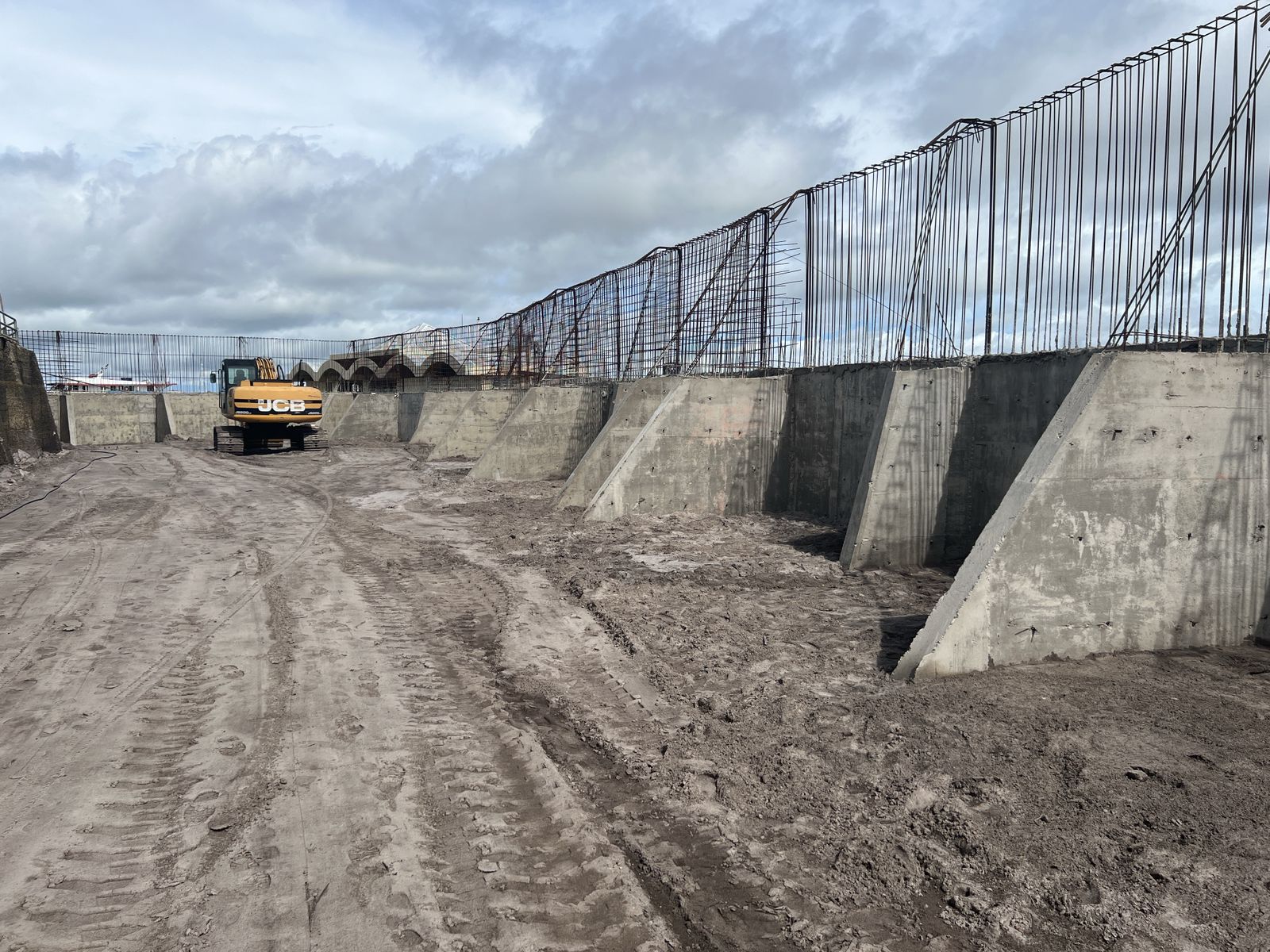 Além deste serviço, estão sendo executadas ainda a construção e montagem da armação de ferro do muro, juntamente com a concretagem da cortina e o aterro da parte interna do paredão.