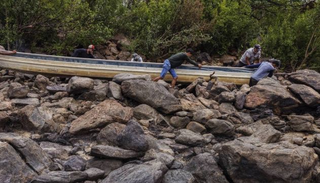 O pescador Valeriano Rodrigues (de boné escuro e barba) e familiares arrastam barco por pedras em trecho seco do rio Xingu em direção a uma área de pesca; com a construção de Belo Monte, são poucos locais para a atividade e a quantidade de pescados é pequena Lalo de Almeida/Folhapress.