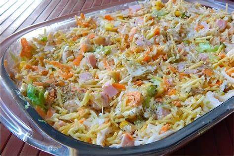 Para fazer essa salada refrescante vamos precisar de ingredientes que são fáceis de conseguir, como cebola, repolho verde, pepino, alho, peito de peru, creme de leite, maionese, azeite, azeitonas verdes, cheiro-verde, orégano, pimenta biquinho, sal, e vinagre.