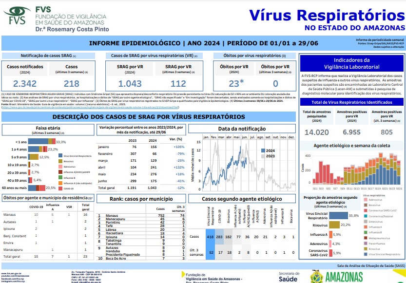 No Amazonas, de 1º/01 a 29/06, foram registrados 2.342 casos notificados de Síndrome Respiratória Aguda Grave ( SRAG), sendo 218 casos nas últimas três semanas (09/06 a 26/06). Desses 2.342 casos notificados de SRAG, foram 1.043 SRAG por vírus respiratórios, sendo 112 nas últimas 3 semanas. Ainda em 2024, até 26 de junho, foram registrados 23 óbitos por vírus respiratórios.