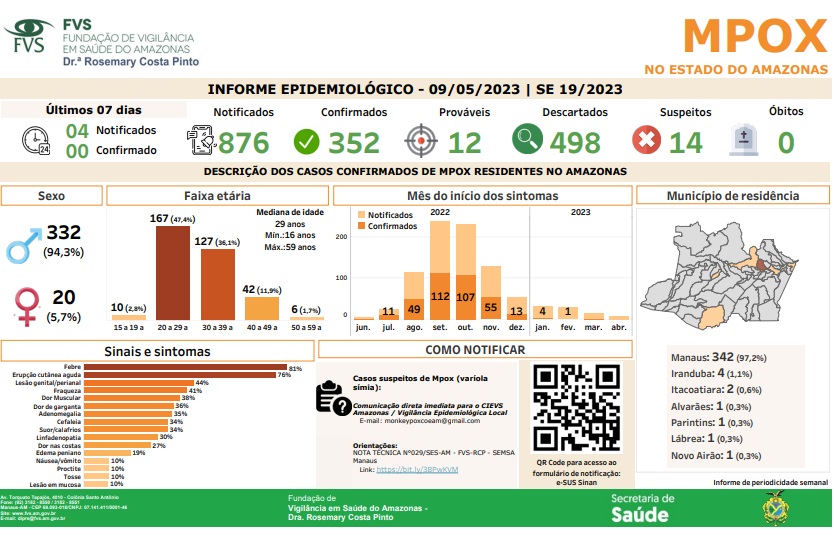 A Fundação de Vigilância em Saúde do Amazonas - Drª Rosemary Costa Pinto (FVS-RCP), vinculada à Secretaria de Estado de Saúde (SES-AM), atualiza, nesta terça-feira (09/05), o novo informe epidemiológico semanal da Mpox.
