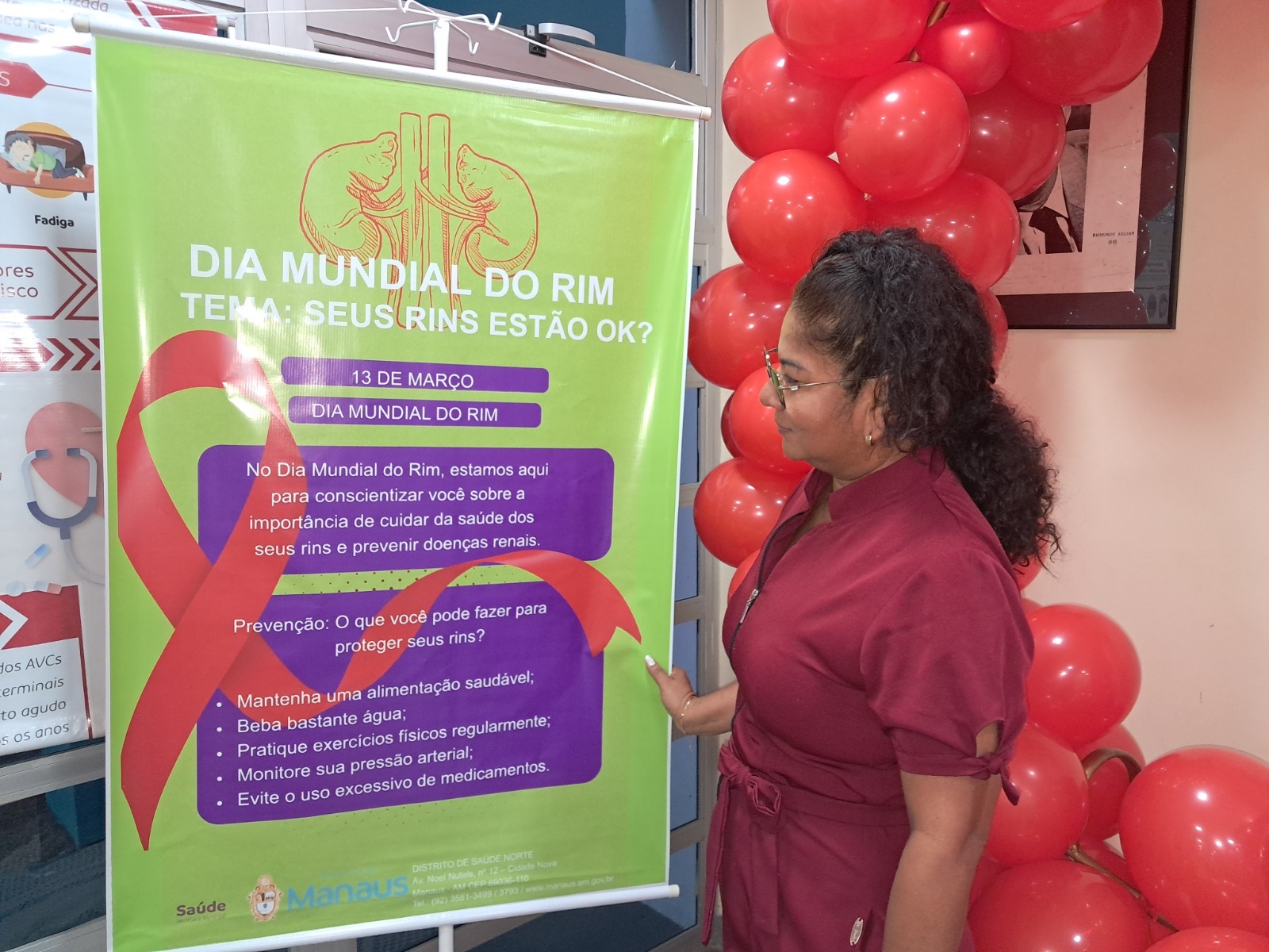 A importância do cuidado com a saúde dos rins foi o tema da ação educativa promovida pela Prefeitura de Manaus, nesta quinta-feira, 13/3, na Unidade de Saúde da Família (USF) Prefeito Manoel Ribeiro, no conjunto residencial Viver Melhor 3, bairro Cidade de Deus, na zona Norte. O evento, realizado em alusão ao Dia Mundial do Rim, comemorado todos os anos na segunda quinta-feira do mês de março, contou com a promoção de palestras e atividade lúdica, abordando as principais formas de manter a saúde renal e prevenir a Doença Renal Crônica (DRC).
