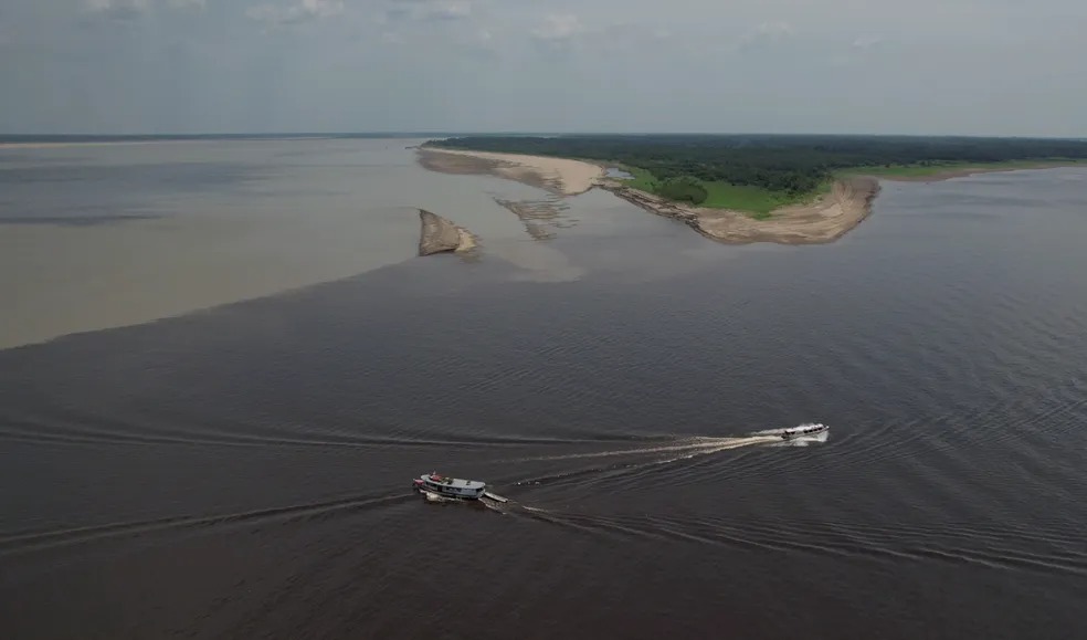 A seca severa que atinge o Amazonas mudou a paisagem do Encontro das Águas, um dos principais pontos turísticos de Manaus. A capital, onde fica localizado o fenômeno natural, está em situação de emergência por conta da estiagem.