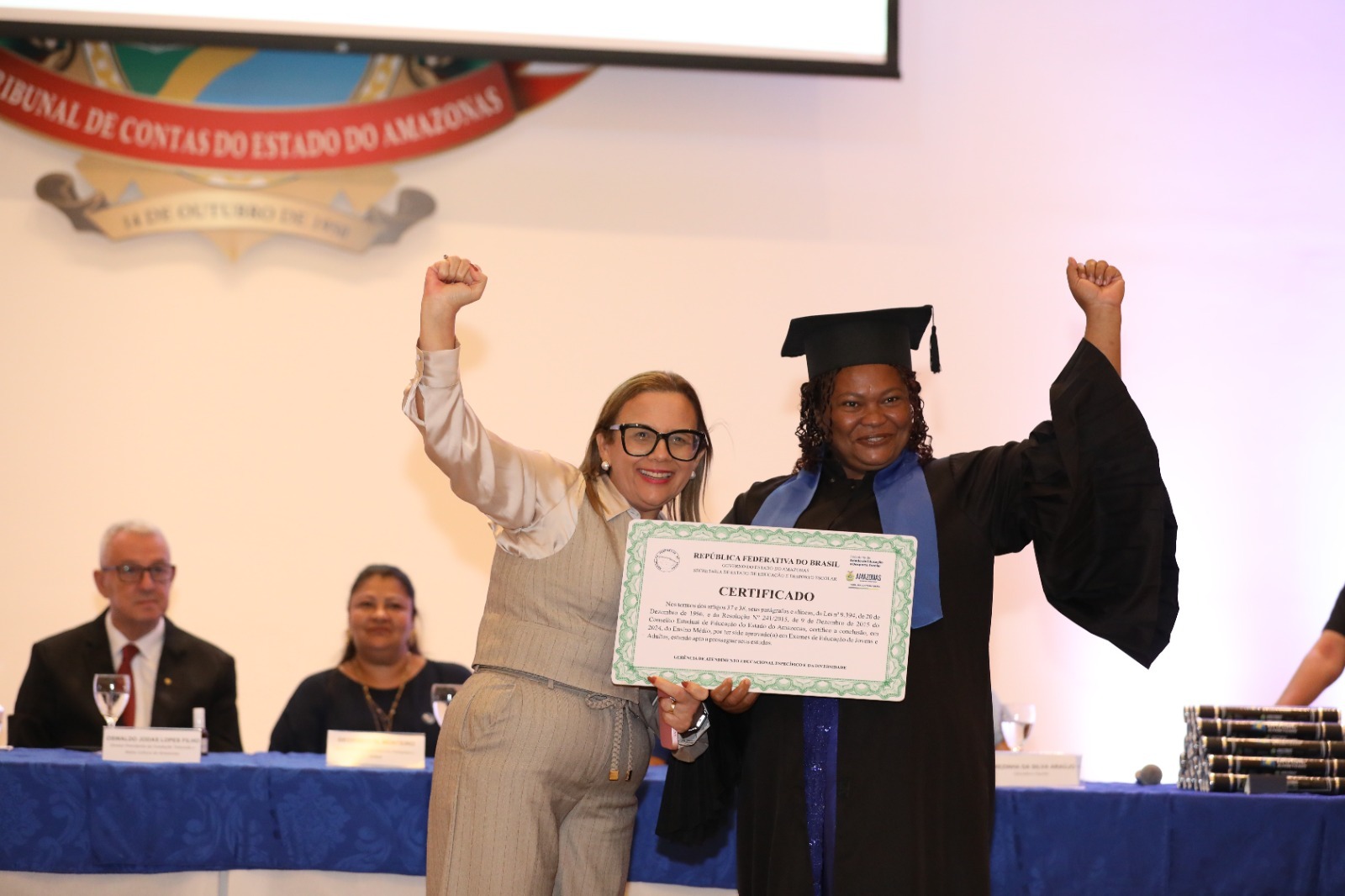 A Secretaria de Estado de Educação e Desporto Escolar, por meio do Departamento de Políticas Educacionais para a Diversidade (DPDI) realizou a cerimônia de formatura do ciclo 2024 do Programa Brasil Alfabetizado (PBA). O evento foi realizado no auditório do Tribunal de Contas do Estado do Amazonas (TCE-AM), e marcou o encerramento de um ano de aprendizado para 109 formandos, jovens e adultos.