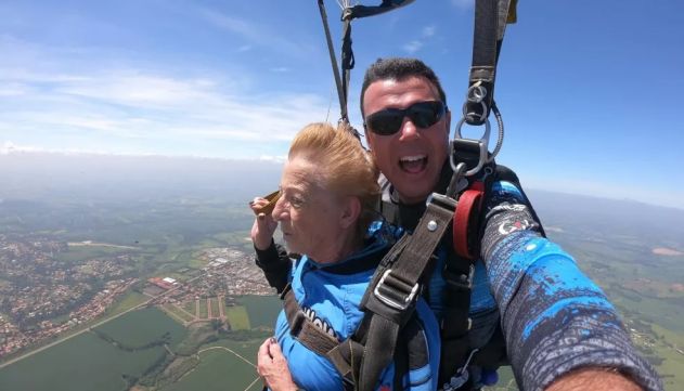 Laura Rodrigues Aguiar pretendia só ver seu neto saltar de paraquedas, mas não imaginava que quem também realizaria esse sonho era ela.
