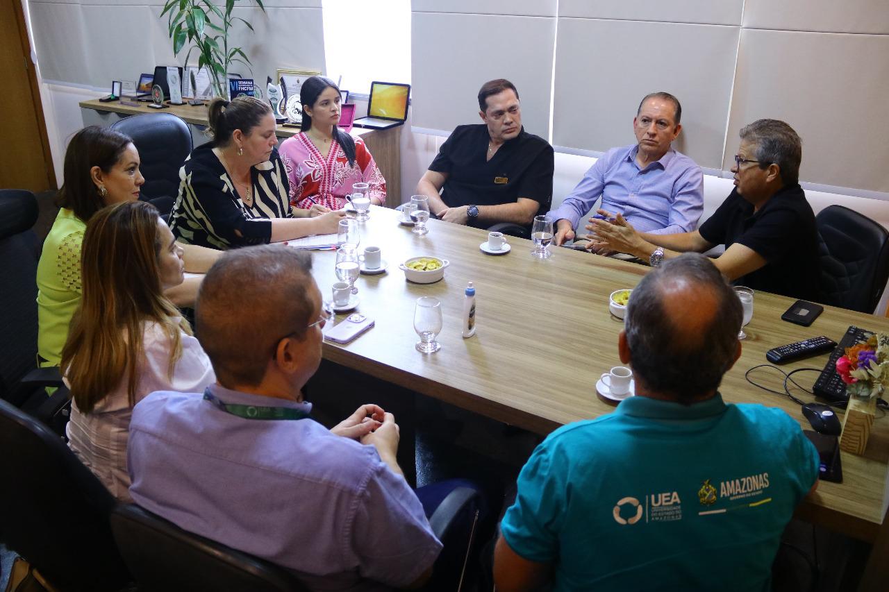 Participaram da reunião, ainda, os professores Antônio Palhares e Manoel Luiz Neto, diretor e coordenador de Qualidade, respectivamente, da Escola Superior de Ciências da Saúde (ESA/UEA), a professora doutora da UEA, Heliamara Ferreira Maia Teles, e o médico reumatologista Domingos Sávio.