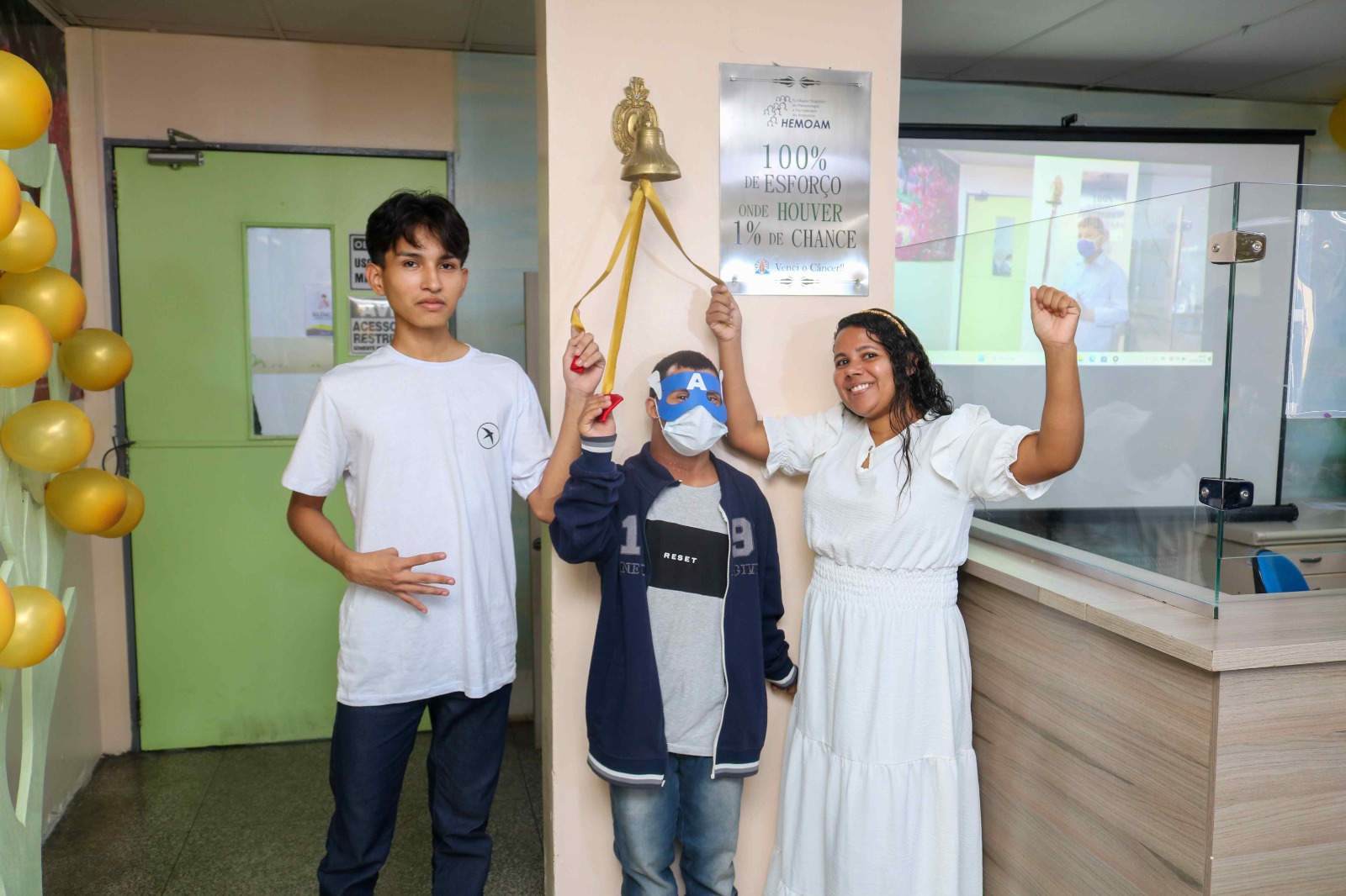 Paulo Vitor Ferreira, de 17 anos, Marlison Gabriel Barbosa, 16 anos e Tatiane Brito, de 30 anos, com diferentes tipos de câncer, tocaram o sino da cura na presença de familiares, médicos e equipe multidisciplinar do Hemoam. O momento foi marcado por muita emoção.