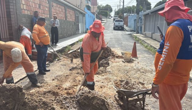 Equipe da Seminf realizando a recuperação de um trecho do sistema de drenagem profunda na rua 11, no bairro Japiim