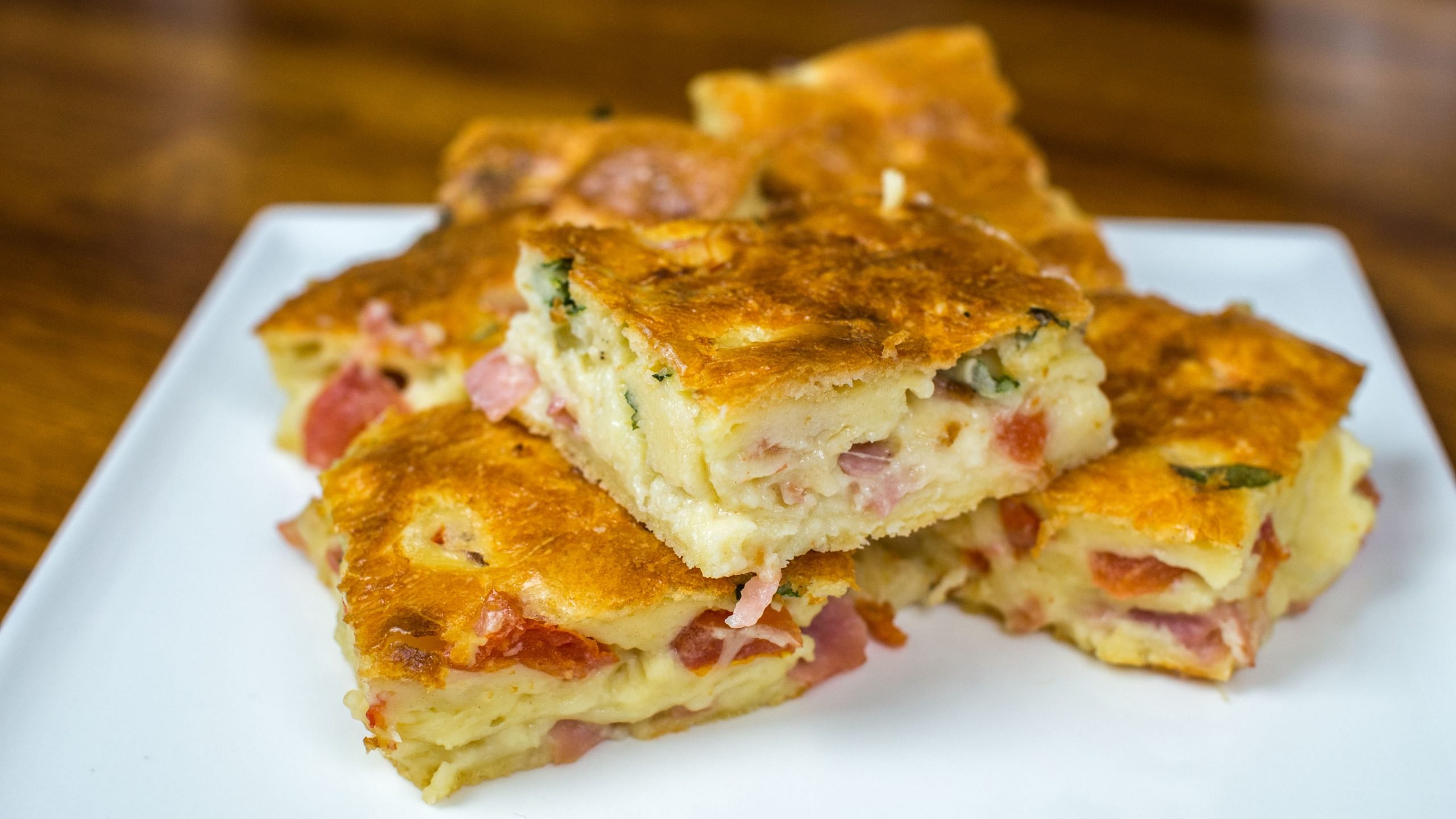 Preaqueça o forno a 180ºC. Unte uma forma média com óleo. Reserve.Bata todos os ingredientes da massa no liquidificador, colocando o fermento por último. Reserve.Para o recheio, esquente o óleo e refogue a cebola.Junte o tomate e refogue até secar a maior parte do líquido da panela. Junte o restante dos ingredientes e misture.Despeje metade da massa na forma, espalhe o recheio e cubra com o restante da massa.Leve para assar por meia hora, ou até dourar.