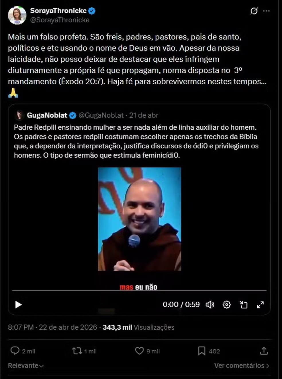 "Mais um falso profeta. São freis, padres, pastores, pais de santo, políticos e etc. usando o nome de Deus em vão. Apesar da nossa laicidade, não posso deixar de destacar que eles infringem diuturnamente a própria fé que propagam, norma disposta no 3º mandamento (Êxodo 20:7). Haja fé para sobrevivermos nestes tempos...".Após repostar o vídeo com a fala do frei Gilson, a senadora Soraya Thronicke publicou um comentário no próprio post em que relembra sua formação católica e cobra posicionamento da Igreja Católica.