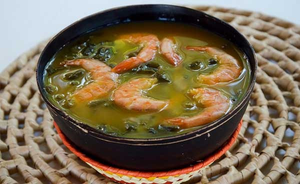 Sirva o tacacá da seguinte forma: em um recipiente, coloque uma concha do tucupi temperado, meia concha do mingau, os camarões e algumas folhas de jambu.