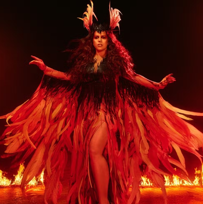 Cada detalhe traduz essa energia, o fogo, a beleza e o poder de ser mulher, mesmo depois das chamas. "Renascer como ato de poder. Meu look foi inspirado na força da Fênix — símbolo de transformação, resiliência e luz infinita.