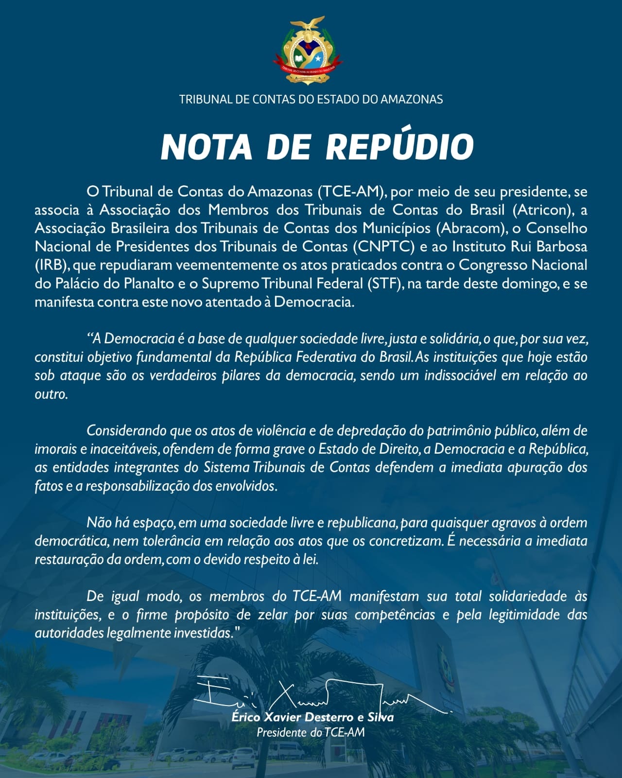 O Tribunal de Contas do Amazonas (TCE-AM), por meio de seu presidente, se associa à Associação dos Membros dos Tribunais de Contas do Brasil (Atricon), a Associação Brasileira dos Tribunais de Contas dos Municípios (Abracom), o Conselho Nacional de Presidentes dos Tribunais de Contas (CNPTC) e ao Instituto Rui Barbosa (IRB), que repudiaram veementemente os atos praticados contra o Congresso Nacional do Palácio do Planalto e o Supremo Tribunal Federal (STF), na tarde deste domingo, e se manifesta contra este novo atentado à Democracia.