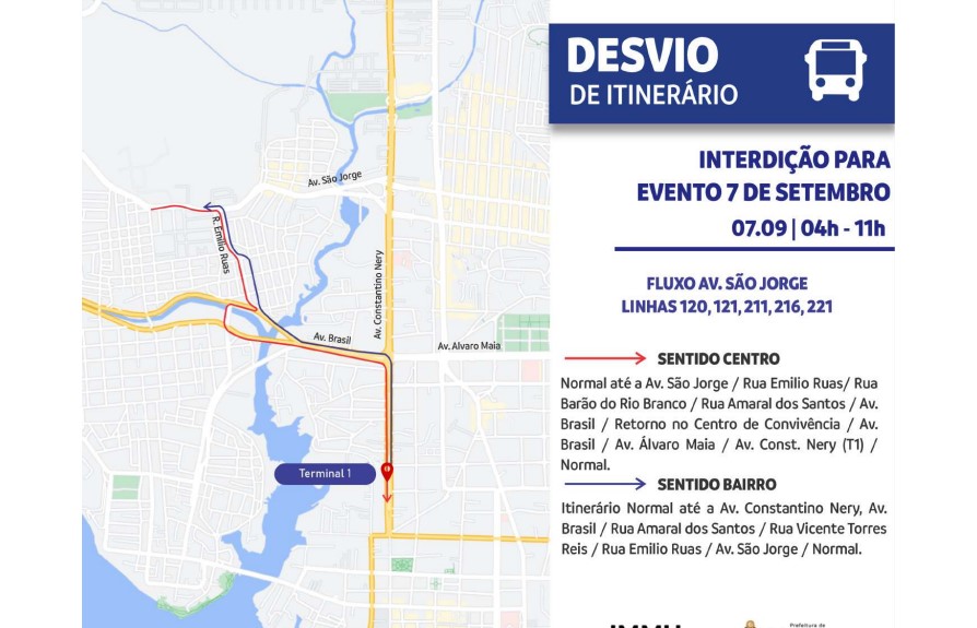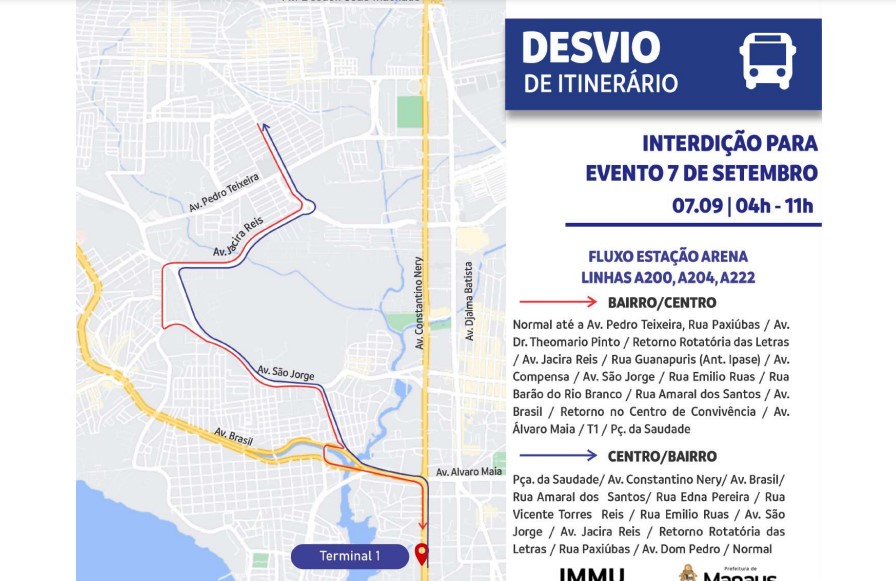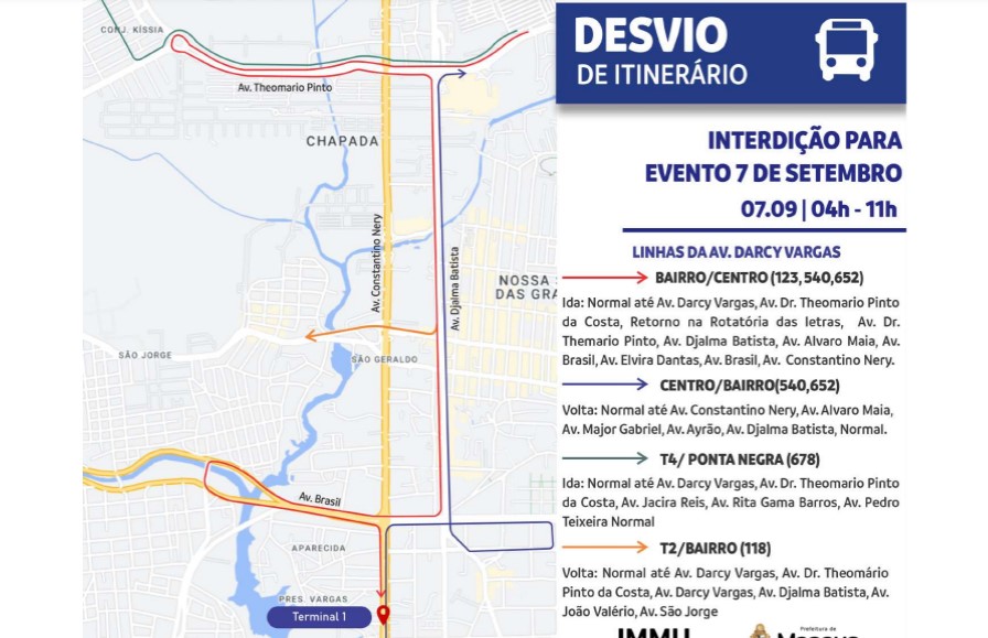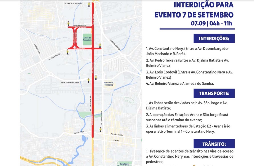 Um esquema de trânsito e transporte foi montado pelo Instituto Municipal de Mobilidade Urbana (IMMU), por conta do Desfile Militar de 7 de setembro, no sábado, 7/9, no centro de convenções Professor Gilberto Mestrinho, o sambódromo, na zona Centro-Sul. O objetivo é garantir a segurança e a mobilidade dos pedestres e dos motoristas que estarão operando os veículos das corporações.