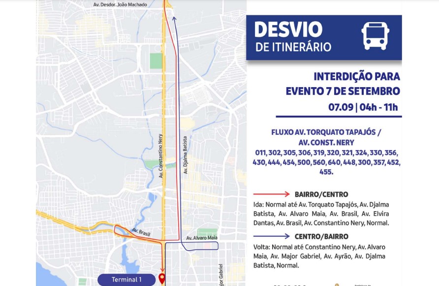 Normal até avenida Torquato Tapajós, avenida Djalma Batista, avenida Álvaro Maia, avenida Brasil, avenida Elvira Dantas, avenida Brasil, avenida Constantino Nery.