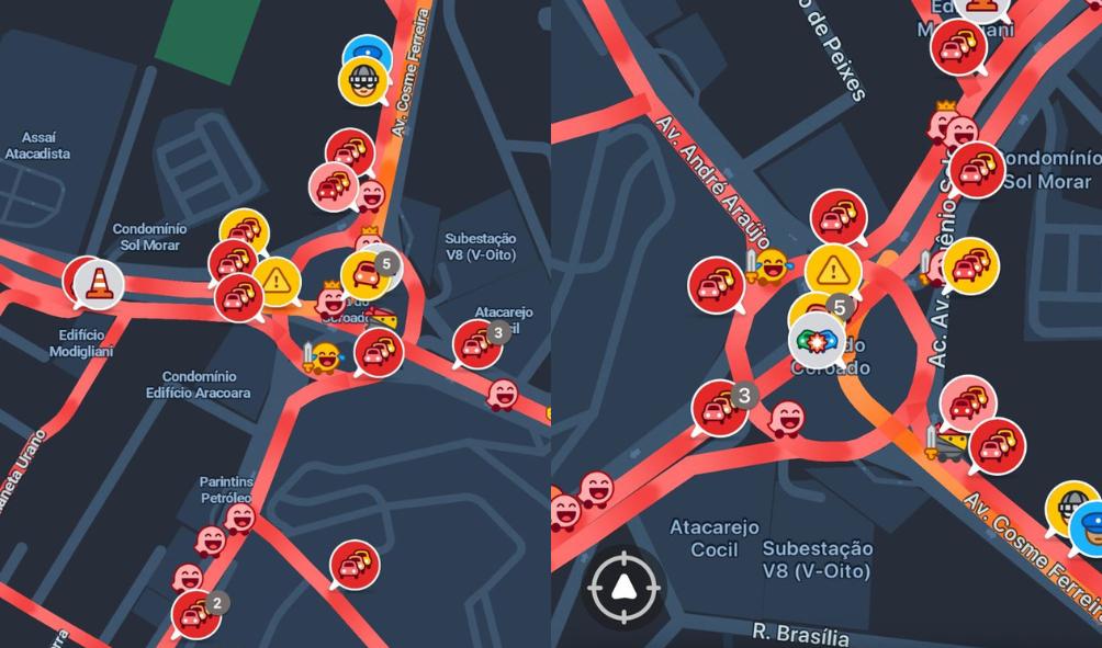 No aplicativo Google Maps, as principais avenidas da capital, até as 19h20 desta terça-feira, ainda apareciam marcadas em vermelho, o que indica trânsito intenso e congestionamentos, além de alertas de acidentes em alguns trechos. Entre os pontos mais críticos estiveram vias que fazem a ligação entre as zonas Centro, Centro-Sul, Sul e Leste da cidade, como a avenida Efigênio Sales, que conecta bairros como Aleixo, Japiim e Coroado, onde condutores enfrentaram engarrafamentos contínuos.
