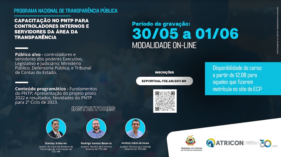 Seguindo o Programa Nacional de Transparência Pública (PNTP) proposto pela Associação dos Membros dos Tribunais de Contas do Brasil (Atricon), o Tribunal de Contas do Amazonas (TCE-AM) realiza, no próximo dia 30 de maio, um treinamento remoto voltado aos controladores internos e responsáveis pela transparência das unidades gestoras dos órgãos públicos do estado.
