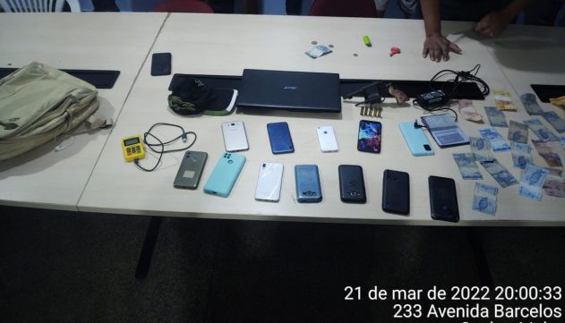 O carro foi interceptado e, na revista, foram encontrados 13 celulares, um notebook, duas carteiras porta-cédula, dois fones de ouvido e R$ 135 em espécie. Também foram apreendidos com os infratores um revólver calibre .38, numeração 237364 e cinco munições intactas.