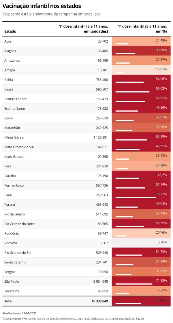 Mais da metade das crianças tomou a primeira dose. Os dados foram coletados pelo consórcio de veículos de imprensa nesta sexta (25).