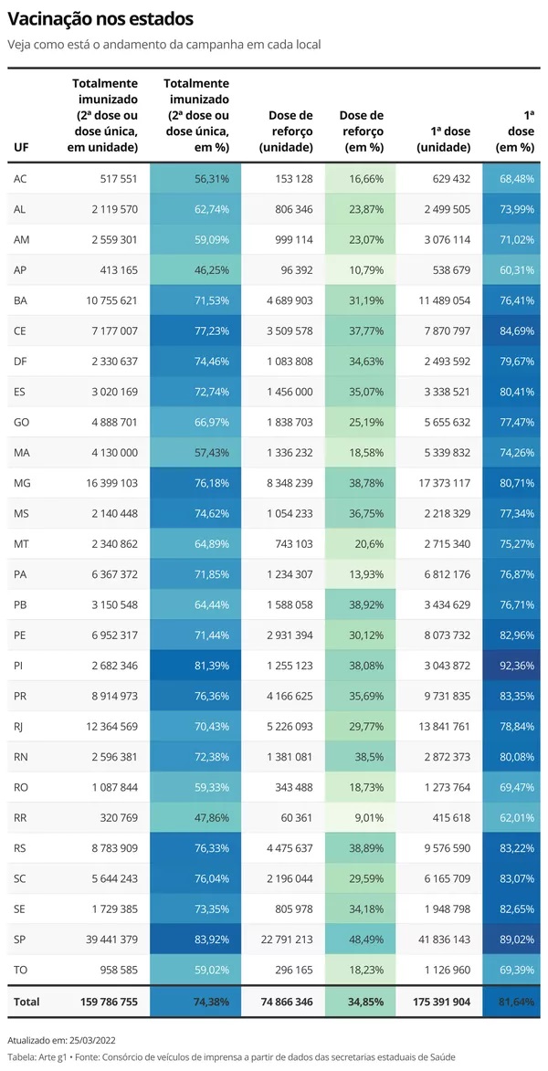 O levantamento é resultado de uma parceria do consórcio de veículos de imprensa, formado por g1, "O Globo", "Extra", "O Estado de S.Paulo", "Folha de S.Paulo" e UOL. Os dados de vacinação passaram a ser acompanhados a partir de 21 de janeiro.