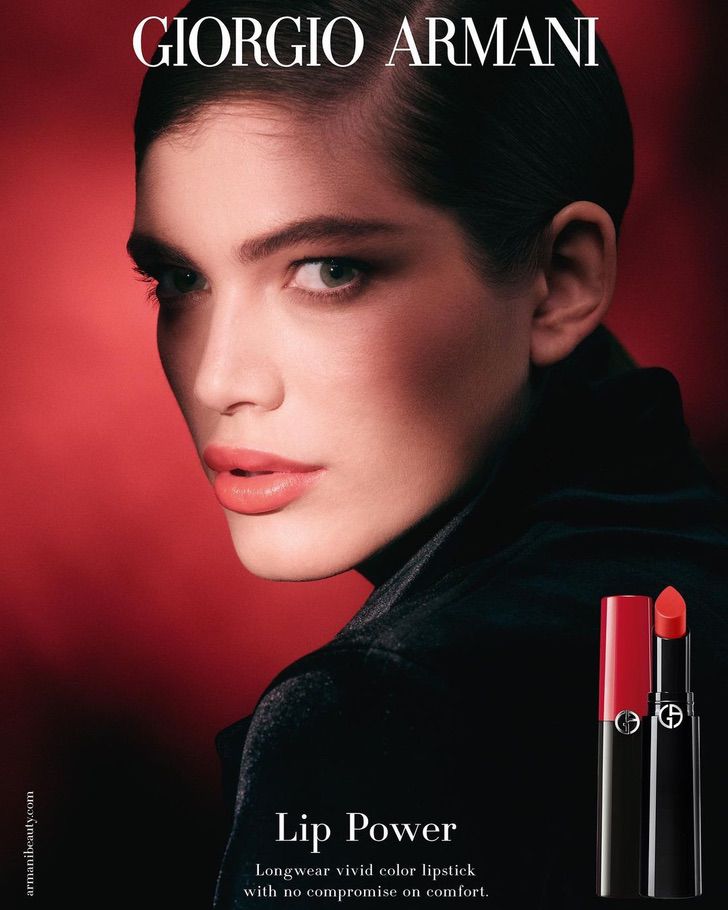 É assim que a modelo protagoniza as campanhas de beleza da marca em 2022, que serão realizadas pelo renomado fotógrafo Mikael Jansson. Como parte de seu primeiro anúncio, um modelo com os batons, Lip Power, que a marca vende.