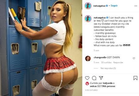 A modelo de 28 anos virou notícia mundial após a curtida papal, ocorrida em novembro de 2020. Na foto, a modelo aparecia de uniforme de colegial estilizado e calcinha fio-dental.