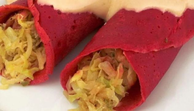 Com massa de beterraba, recheio de repolho e molho branco, essa panqueca fica uma delícia e é muito nutritiva