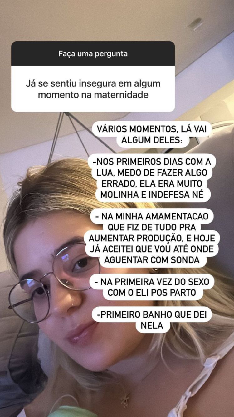 "Vários momentos de insegurança. Lá vão alguns deles: nos primeiros dias com a Lua, medo de fazer algo errado. Ela era muito molinha e indefesa; na minha amamentação, que fiz de tudo para aumentar a produção de leite, e hoje já aceitei que vou até onde aguentar com a sonda; na primeira vez do sexo com o Eli pós-parto; primeiro banho que dei nela", detalhou.