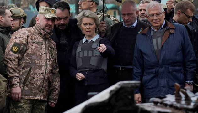 Ali, vestindo um colete a prova de balas, a líder do Executivo da UE acompanhou a exumação de corpos de uma das valas. Ela estava acompanhada de Josep Borrell, chefe da diplomacia do bloco.