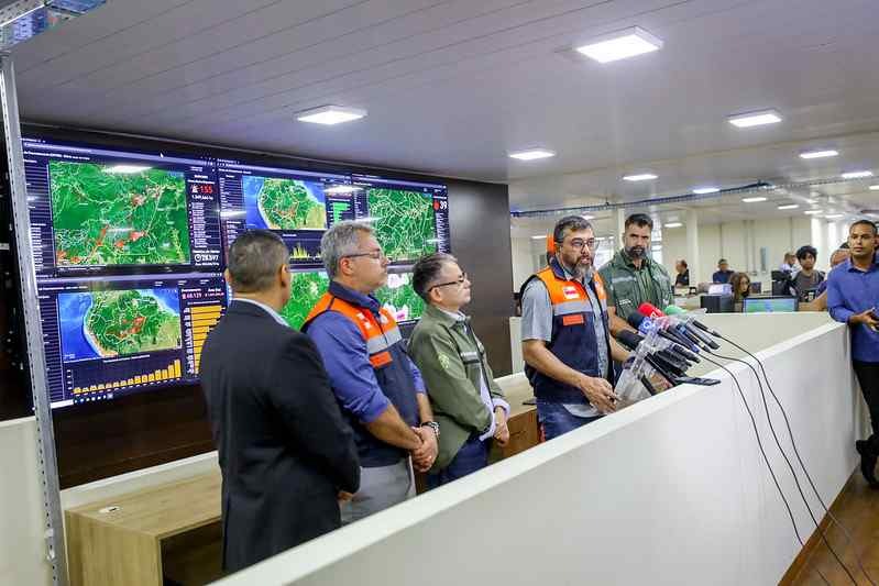 Governador do Amazonas esteve no Centro de Monitoramento do Ipaam e atualizou as ações frente ao impacto da forte seca e do número de queimadas