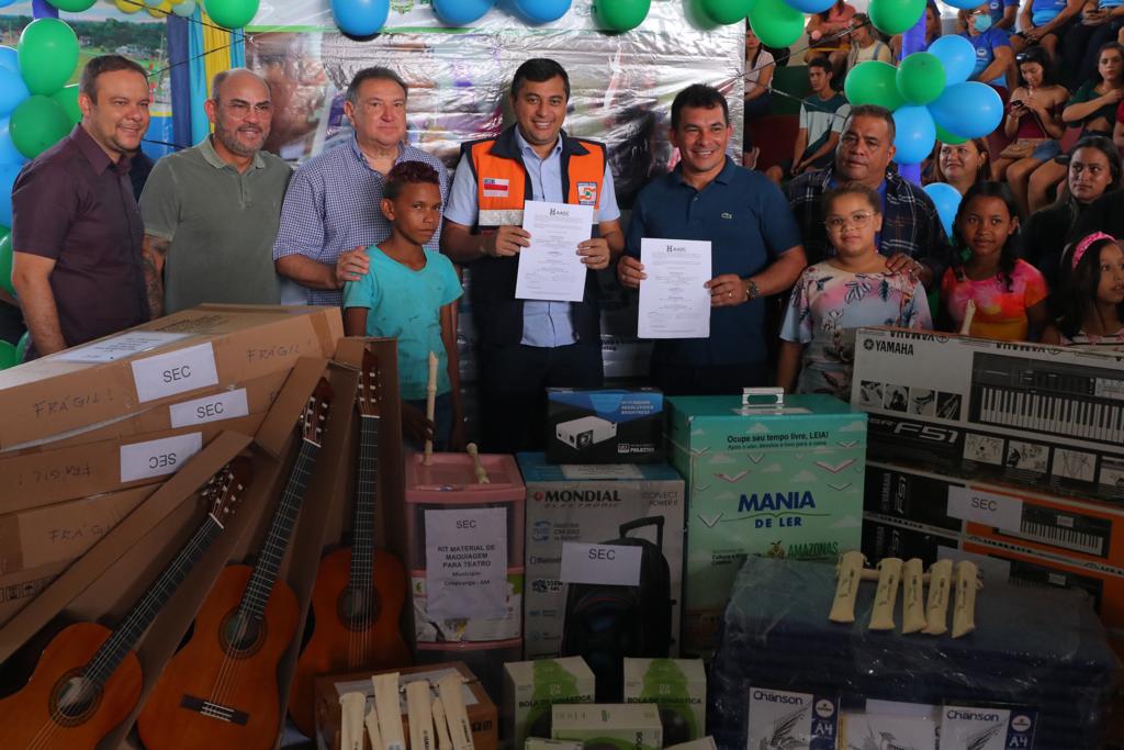 Em Caapiranga, a Secretaria de Cultura e Economia Criativa (SEC) também fez a entrega de instrumentos por meio da Sala de Cultura. Foram repassados dez violões, cinco teclados, 50 flautas doce, material para aulas de dança, teatro, música, artes visuais, maquiagem artística, além de projetor e de uma estação da leitura do Mania de Ler.