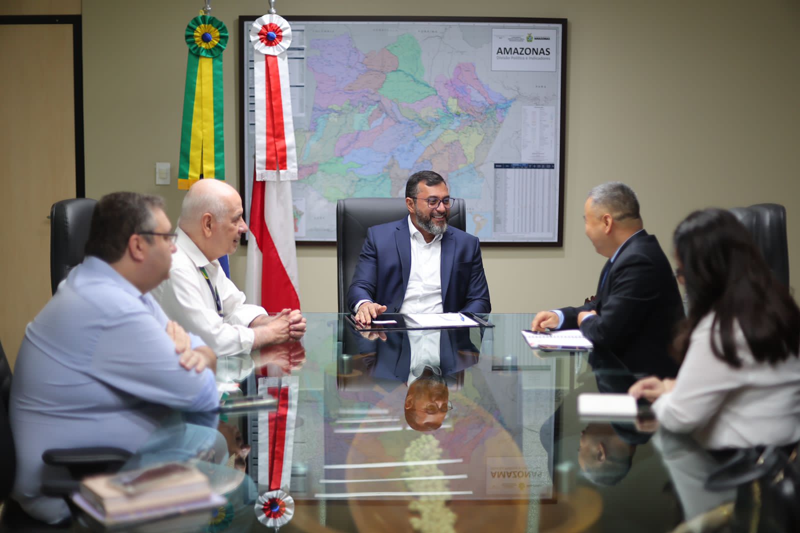 O governador Wilson Lima reuniu, nesta segunda-feira (18/09), com representantes da BYD Auto, fabricantes de veículos elétricos que possuem uma fábrica de baterias no Polo Industrial de Manaus. O encontro faz parte da política para atrair novos investidores que utilizam energia limpa, a exemplo dos carros, caminhões e ônibus elétricos.