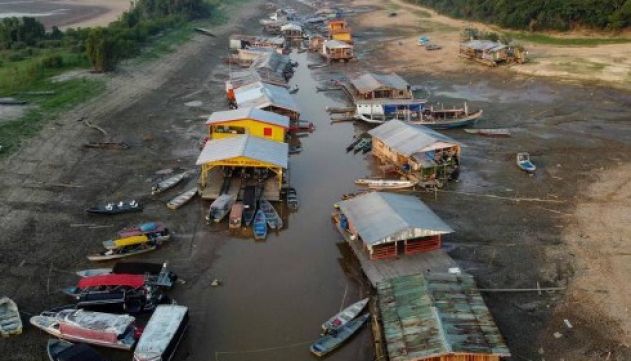Seca na Amazônia transforma lago de vila flutuante em lama