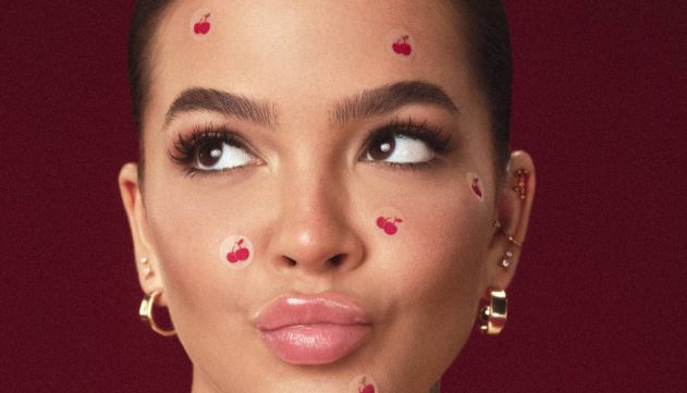 Mulher jovem com cabelo preso, usando regata branca, com pequenos adesivos vermelhos de maçã espalhados pelo rosto. Marcas têm apostado em criar as próprias versões, caso d'O Boticário, que lançou em fevereiro adesivos com desenho de cereja. Até mesmo o cantor Justin Bieber colocou à venda, nesta semana, sua linha de "acne patches" (o nome em inglês dos secativos), em parceria com a esposa, Hailey Bieber, dona da marca de beleza Rhode. O interesse de pesquisa por adesivos para espinha atingiu o pico neste mês, segundo dados do Google Trends.