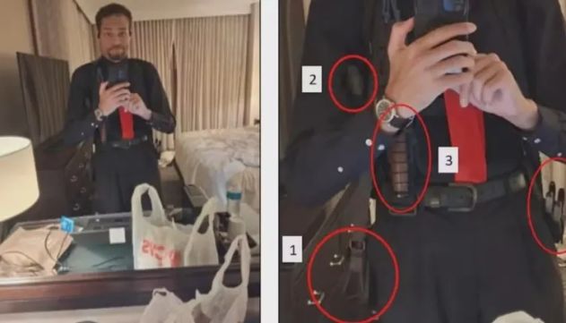 As imagens mostram o suspeito em um quarto de hotel, em frente ao espelho, com diversas armas presas ao corpo. Entre os itens identificados estão uma pistola semiautomática, uma espingarda, três facas e uma bolsa com munições. Segundo o documento, os registros fotográficos foram feitos pouco antes de Allen deixar o hotel. Promotores argumentam que o material evidencia planejamento e intenção deliberada, reforçando o pedido para que ele permaneça preso até o julgamento.